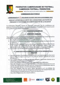 COMMUNIQUÉ DE LA COMMISSION ÉLECTORALE DE LA FECAFOOT PORTANT OUVERTURE DU DÉPÔT DE CANDIDATURES AUX POSTES DE PRÉSIDENT ET MEMBRES DU COMITÉ EXÉCUTIF DE LA FECAFOOT
