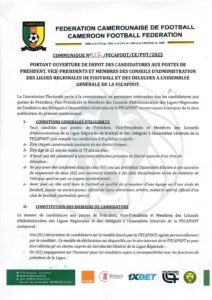 COMMUNIQUE DE LA COMMISSION ÉLECTORALE PORTANT OUVERTURE DU DÉPÔT DE CANDIDATURES AUX POSTES DE PRÉSIDENT, VICE-PRÉSIDENTS DES LIGUES RÉGIONALES ET DES DÉLÉGUÉS A L’ASSEMBLÉE GÉNÉRALE DE LA FECAFOOT