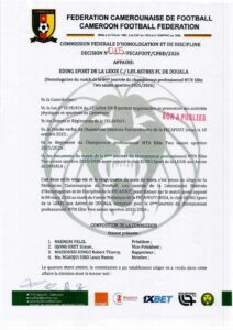 DECISION 015_AFFAIRE EDING SPORT DE A LEKIE C. LES ASTRES FC DE DOUALA