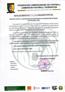NOTE DE SERVICE À L’ATTENTION DU PERSONNEL DE LA FECAFOOT RELATIVE À L’APPEL À CANDIDATURE POUR LE PROGRAMME DE FORMATION FIFA EN DROIT DU FOOTBALL